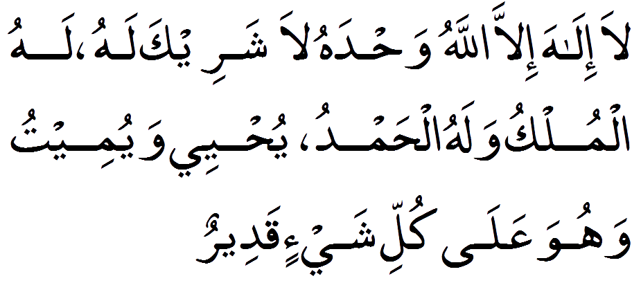 None has the right to be worshipped except Allah, alone, without partner, to Him belongs all sovereignty and praise, He gives life and causes death and He is over all things omnipotent.